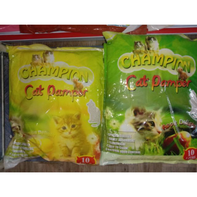 Pasir Champion dapat menyerap kotoran kucing dengan cepat. CPA-010 Champion Cat Pamper Apple 10L. Disebabkan tidak bergumpal apabila kucing anda membuang air ia akan terurai menjadi habuk dan debu.
